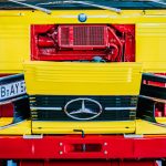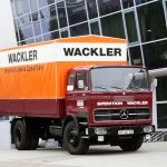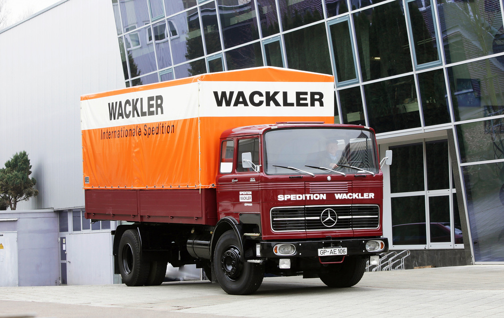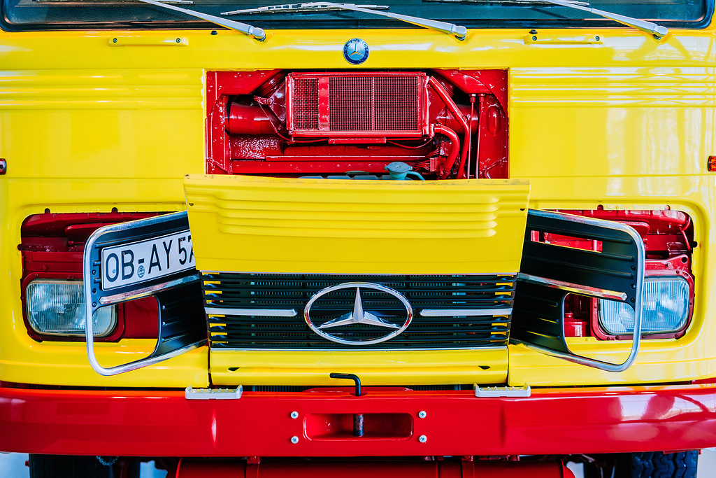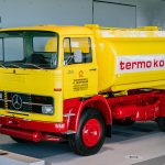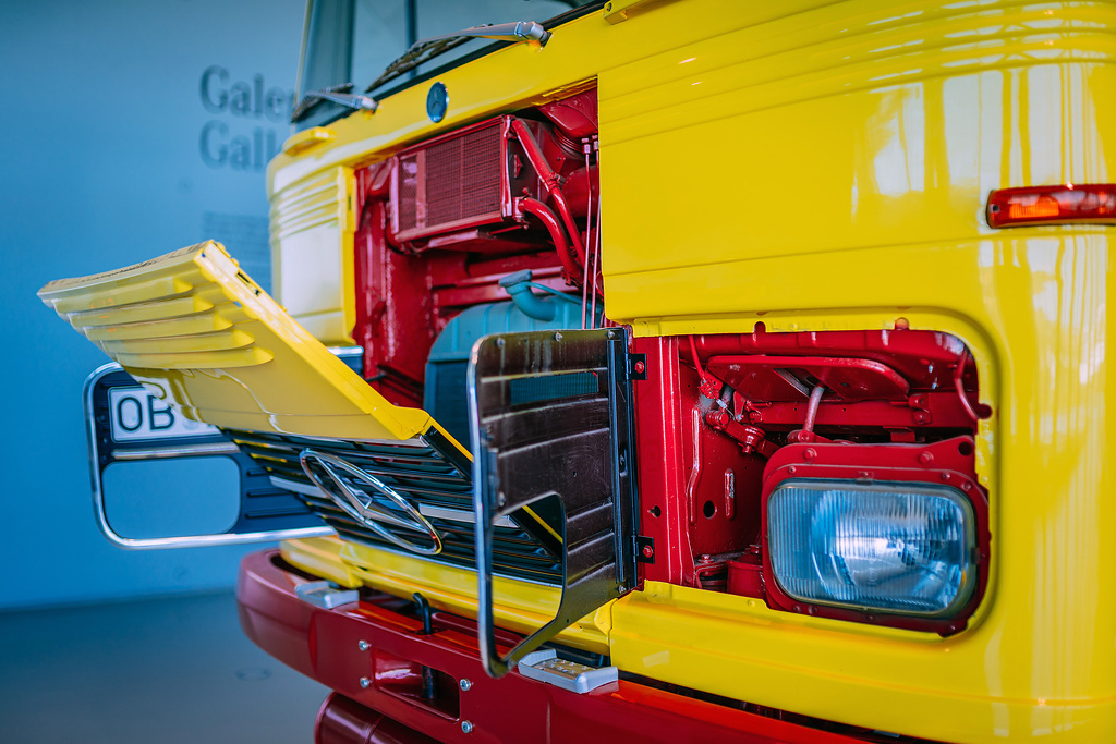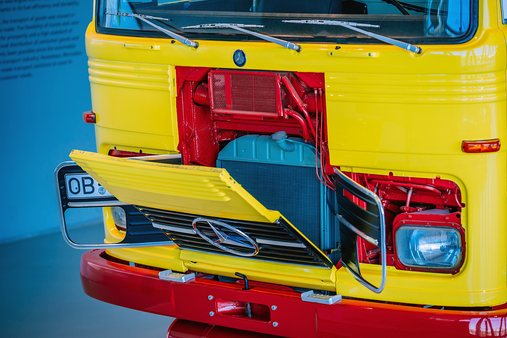 Cabine cúbica: o tanque de óleo para aquecimento do Museu Mercedes-Benz, construído em 1974, pertence à série de veículos comerciais de porte médio com a chamada cabina cúbica, introduzida em 1965. Esta geração de caminhões com a estrela também foi disponível em uma versão leve (também a partir de 1965 – como os primeiros produtos da então nova fábrica em Wörth) e em uma versão pesada já em 1963. Visualmente, as três classes podem ser distinguidas pela posição do farol, para Exemplo: nos “calendários do advento” leves preenchem toda a altura da grade do radiador, nos caminhões médios preenchem a metade inferior e nos veículos comerciais pesados possuem os faróis abaixo do radiador.