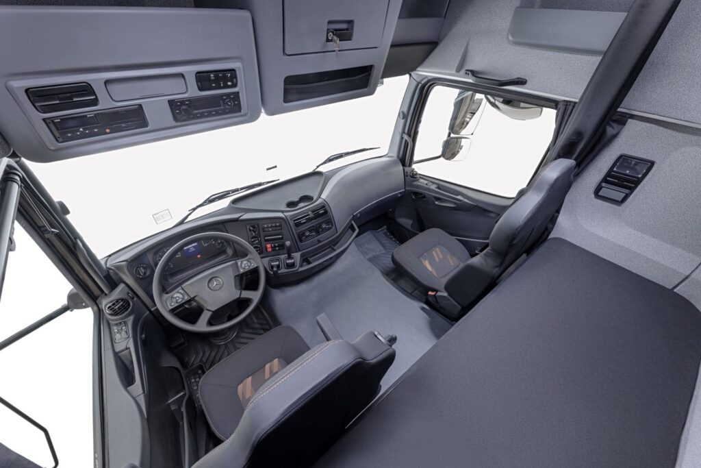 Entre as novidades da cabina do novo Axor incluem-se ainda volante multifuncional de série, novo painel, partida por botão, chave inteligente, alavanca do câmbio combinada com o freio auxiliar e integrada na coluna de direção, display do painel de 12,7 cm com EcoSupport (sistema de avaliação de condução), banco pneumático com 11 regulagens, referência no mercado em conforto e ergonomia e disponibilidade de geladeira como opcional.