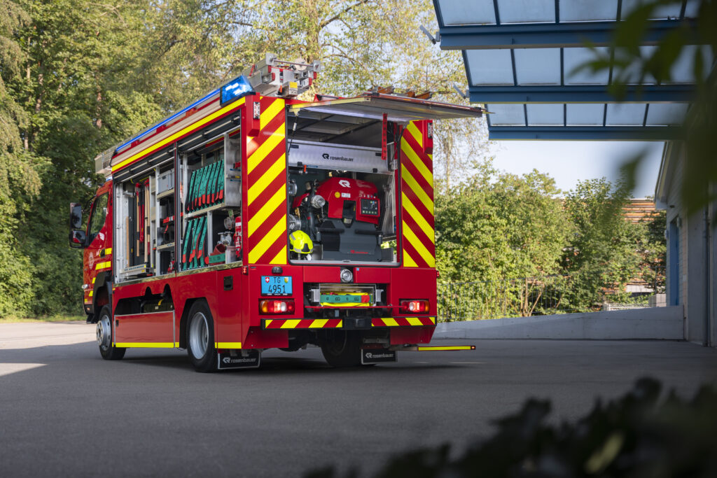 A Rosenbauer Suíça, com sede em Oberglatt, equipou o chassi Canter com uma carroceria personalizada que também considera o espaço de instalação da caixa de transferência e aproveita ao máximo a distância entre eixos de 3.415 mm. Os elementos centrais são um tanque de água de extinção de 1.500 litros posicionado centralmente e uma potente bomba de incêndio portátil Rosenbauer FOX 4 acessível pela parte traseira, permitindo aos serviços de emergência realizar um ataque inicial até que o abastecimento de água seja estabelecido através de um hidrante.