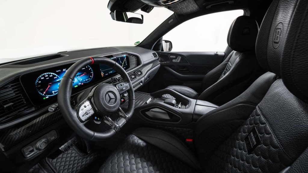 Brabus mantém a estética escura para o interior. Uma mistura de couro preto e Alcantara cobre a cabine. O acabamento apresenta uma mistura de fibra de carbono e elementos foscos Shadow Grey.