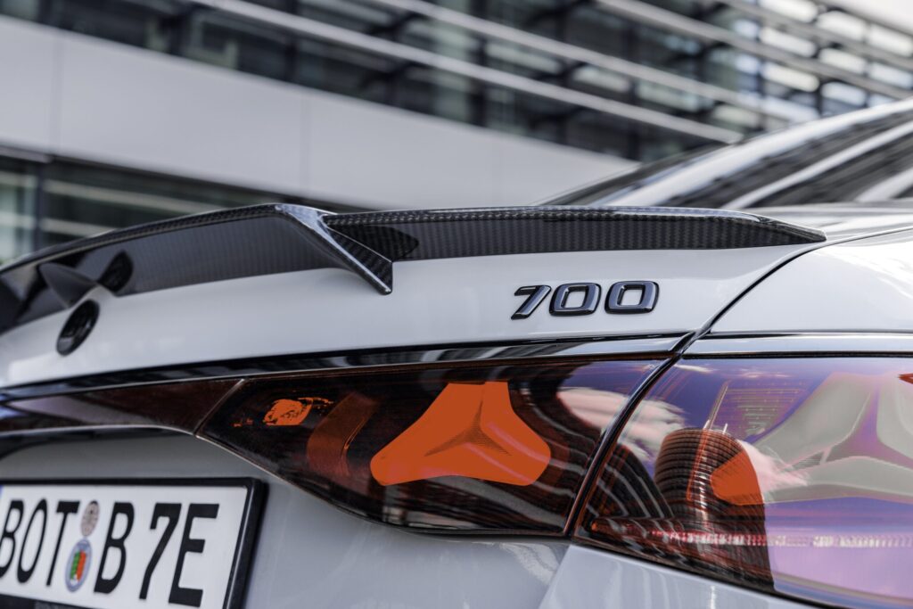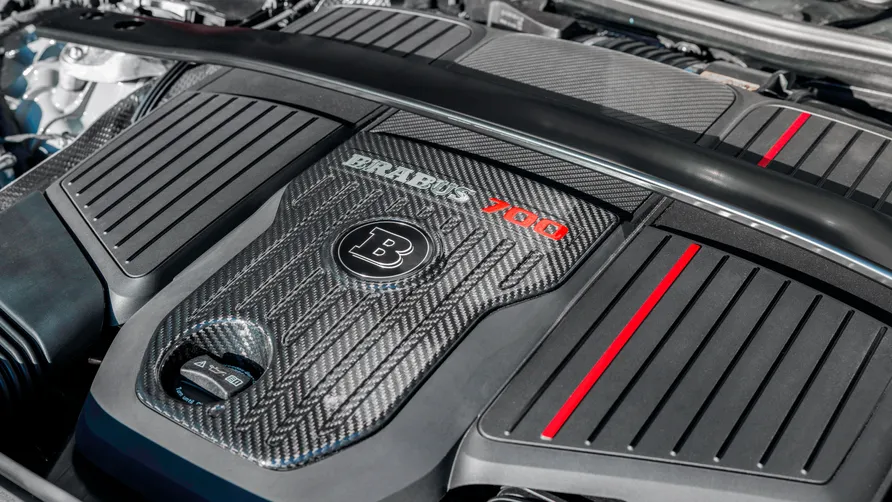 Esteticamente, a Brabus foca em esportividade: há elementos de carbono expostos feitos sob medida – opcionalmente selados com acabamento fosco ou de alto brilho. O spoiler dianteiro é confeccionado em três partes, os painéis de saída de ar esportivos e o difusor traseiro com ponteiras de escape integradas de titânio/carbono colaboram para um visual único. Um spoiler traseiro discreto e opcional proporciona força descendente adicional em altas velocidades.