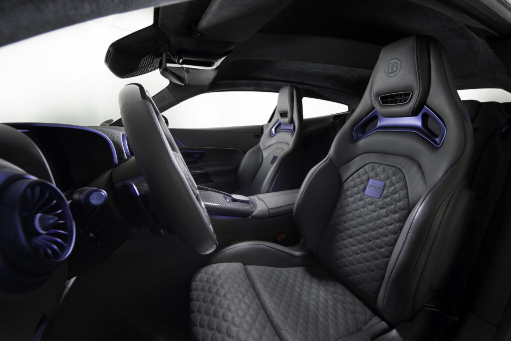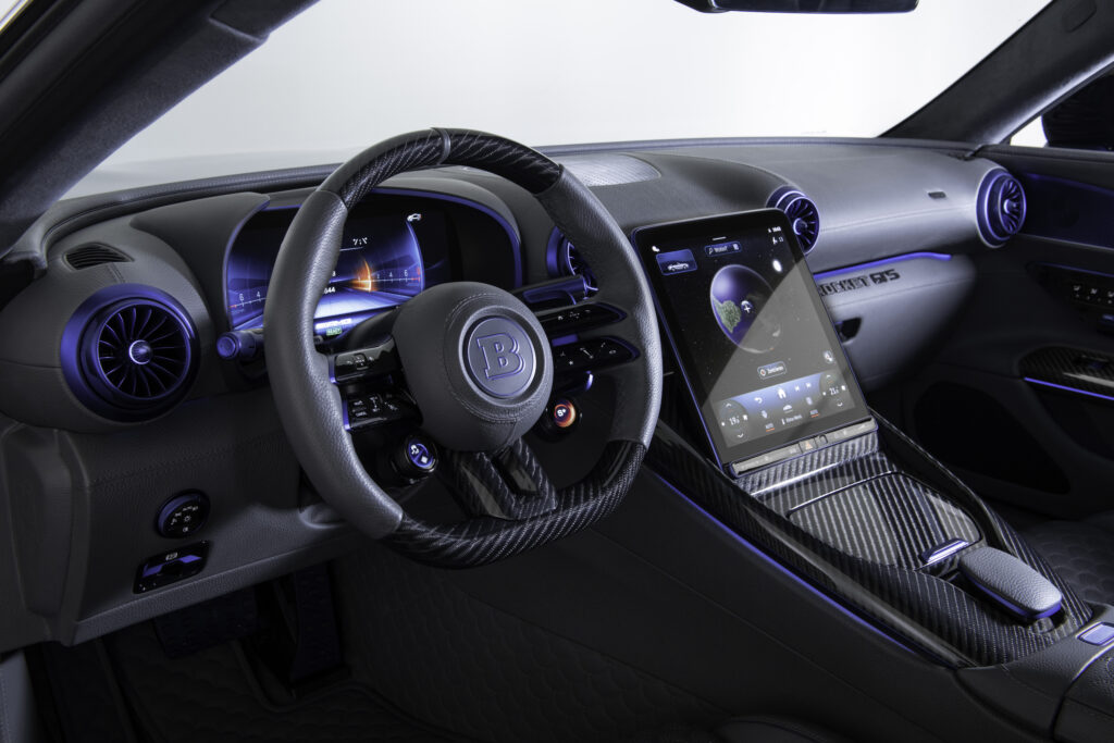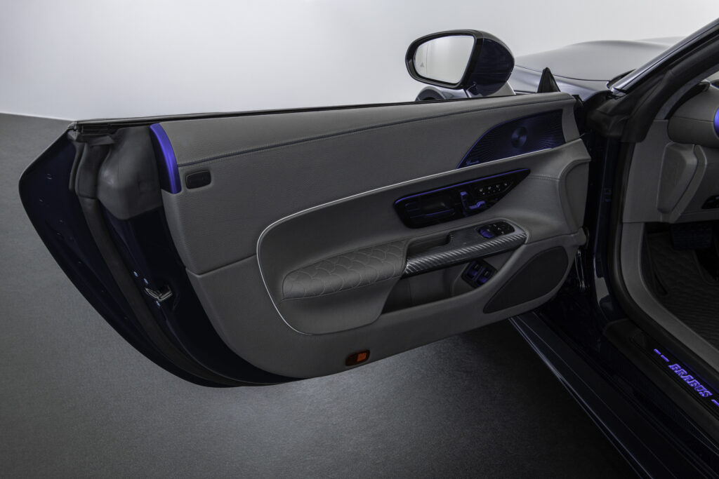 O pacote Deep Blue também conta com novas e exclusivas rodas Monoblock P Platinum Edition (21 polegadas na dianteira e 22 polegadas na traseira). Aliás, estas foram projetadas não apenas para dar um toque visual, mas também com um design de cinco raios que envia ar de resfriamento ativamente para os freios BRABUS personalizados. O uso desenfreado de fibra de carbono, além de um revestimento leve acarpetado – ei, cada pequena ajuda… – ajuda a reduzir o peso do SL 63 para abaixo da marca de 2.275 kg, embora a BRABUS não forneça um número específico.