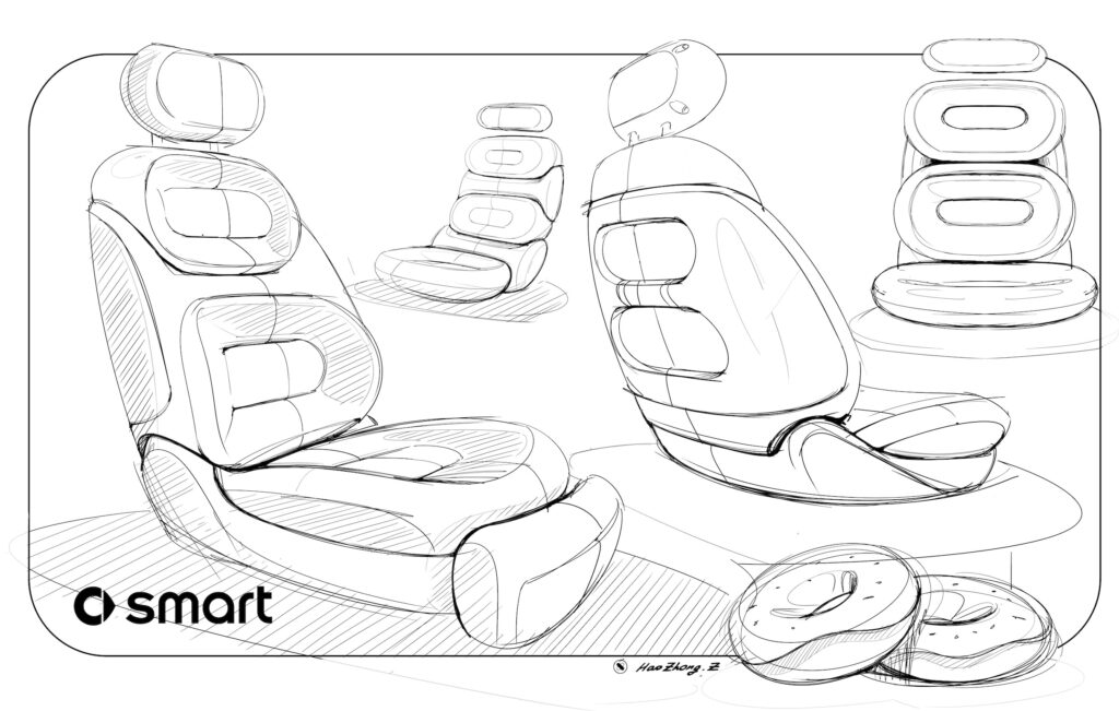 A arte do conceito mostra os bancos dianteiros incluindo um assento tipo ‘rainha’ para o passageiro completo com apoio para as pernas. A partir de imagens do interior, sabemos que o carro de produção contará com uma longa tela dupla composta por uma unidade de infoentretenimento e uma tela de entretenimento para o passageiro. Isto difere significativamente da configuração atual do Smart, embora o volante seja semelhante ao do Smart #3.