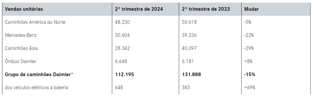 A Daimler Truck vendeu 112.195 caminhões e ônibus no segundo trimestre de 2024, uma queda em comparação ao segundo trimestre do ano anterior (Q2 2023: 131.888). O segmento Trucks North America contribuiu com 48.230 unidades para as vendas totais do Grupo (Q2 2023: 50.618). A Mercedes-Benz atingiu 30.604 unidades vendidas (Q2 2023: 39.236).