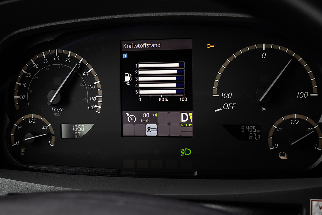 “Durante a jornada, os engenheiros de teste monitoraram constantemente inúmeros pontos de medição e dados”, explicou o gerente de teste Jonas Steinki. Além das temperaturas da bateria, célula de combustível, motores e habitáculo, também incluem o consumo de energia da propulsão, aquecimento e outros consumidores auxiliares, o nível de carga das baterias e o nível de enchimento dos tanques de hidrogênio. Os engenheiros de teste Rainer Bickel, Stephan Lutz e Hannes Mayer verificaram continuamente os parâmetros mais importantes do sistema de célula de combustível, direção, gerenciamento térmico e aquecimento em seus monitores, procurando por anomalias e comparando os dados com os valores alvo calculados.