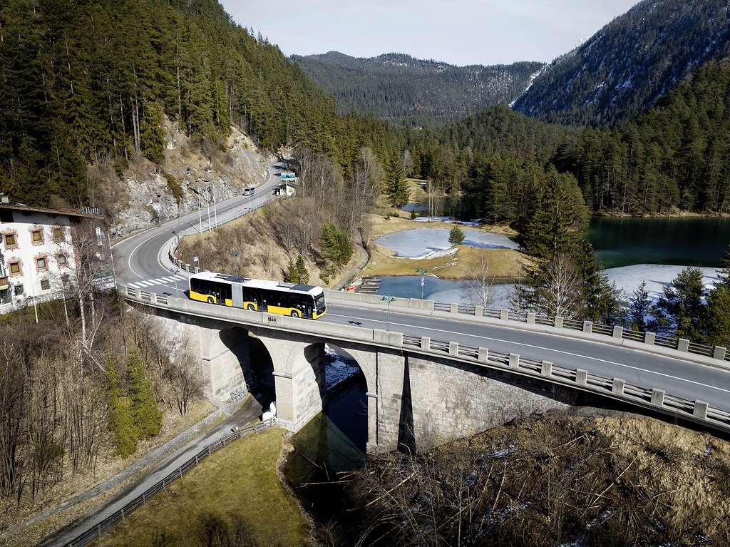 No caminho pela passagem de Fern, logo ficou claro que a célula de combustível eCitaro era capaz de lidar com a exigente rota ainda melhor do que o esperado. “Apesar do gradiente, a célula de combustível operou dentro da faixa de potência mais eficiente de 20 a 30 kW”, explicou Rainer Bickel, apontando para o valor correspondente no monitor. “Além disso, o novo gerenciamento térmico reutiliza o calor residual da célula de combustível para controlar a temperatura interna. O aquecimento elétrico é, portanto, pouco utilizado, de modo que o consumo total de energia de todas as unidades auxiliares, como aquecimento, direção e compressor, permanece em um nível muito baixo.”