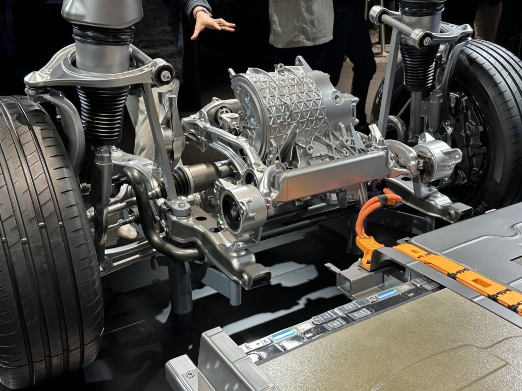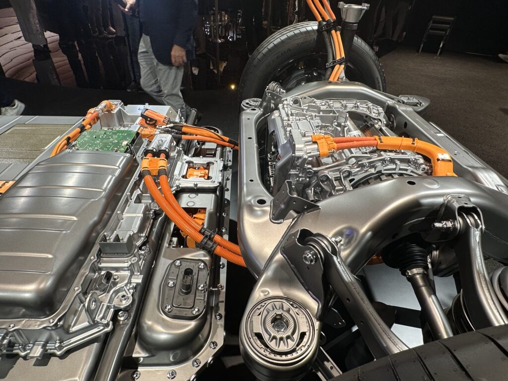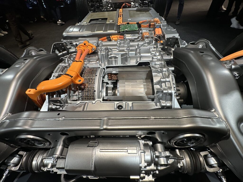 Outro destaque é a transmissão de duas velocidades no eixo traseiro. A primeira marcha, com relação de 11:1, permite aceleração potente e alta capacidade de reboque, enquanto a segunda marcha (5:1) garante um cruzeiro tranquilo e baixo consumo de combustível em velocidades de rodovia. O sistema de propulsão é apoiado por uma eletrônica de potência de alto desempenho com inversores de carboneto de silício, que minimizam as perdas de energia e utilizam plenamente a tecnologia de 800 volts do veículo.