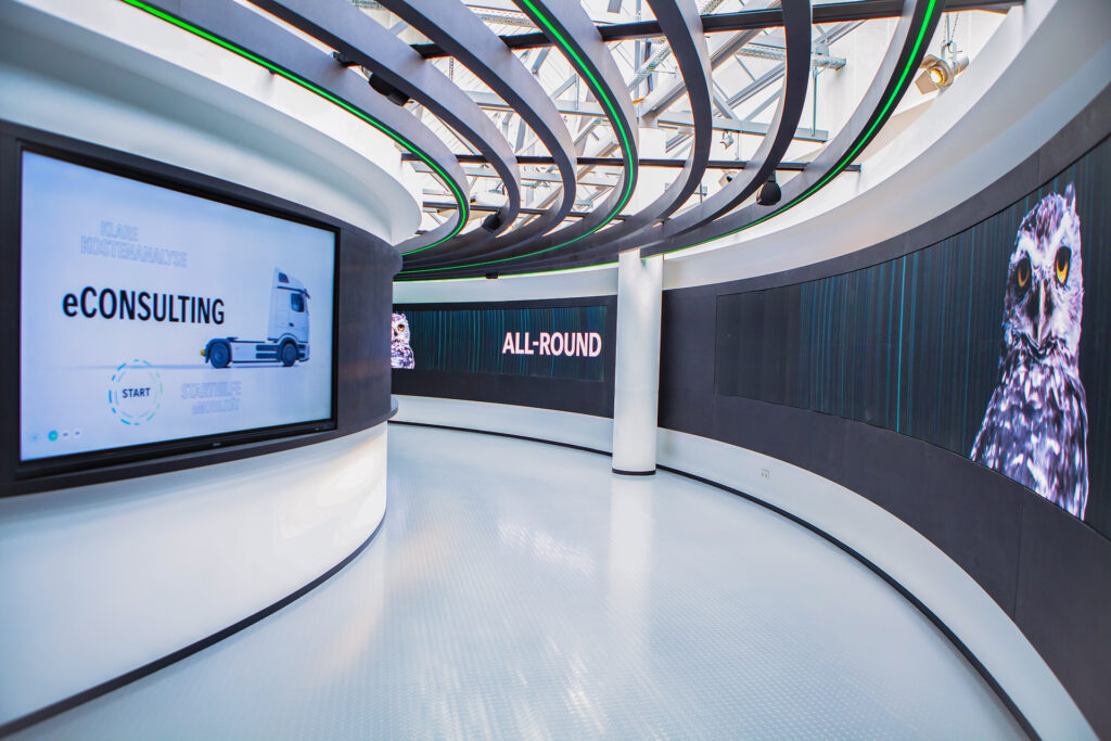 A visita ao eActros 600 Experience World começa no cinema com um pequeno filme promocional sobre a Mercedes-Benz Trucks e a fábrica em Wörth. Segue-se uma estação com grandes ecrãs tácteis onde os visitantes podem explorar as diversas vertentes da e-mobilidade e do eActros 600 – com particular enfoque no conforto e design, rentabilidade, sustentabilidade e serviços como o eConsulting. Na parte externa, uma parede de LED com 23 metros de comprimento exibe diversos filmes incríveis sobre o eActros 600. Por fim, o destaque do pavilhão é o próprio veículo, apresentado em um semicírculo aberto de 120 metros quadrados, com área de 40 metros quadrados. Parede LED e instalação de iluminação.