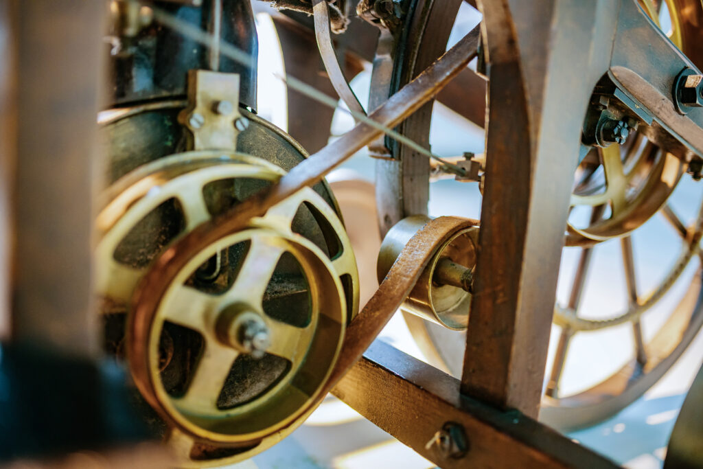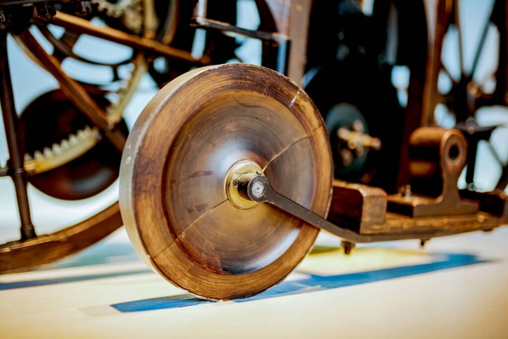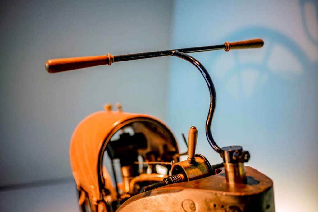 O pequeno tanque de latão com funil e bomba atrás do motorista parece um tanque de gasolina. Ele também contém combustível – mas não para acionar o motor. Em vez disso, o pequeno tanque fornece a chama da ignição por tubo incandescente do motor Daimler. Este é o coração do veículo de duas rodas. Em 3 de abril de 1885, Gottlieb Daimler registrou um pedido de patente para o motor de alta velocidade com cilindro vertical. O apelido, devido à sua aparência característica, é “relógio de pêndulo”.