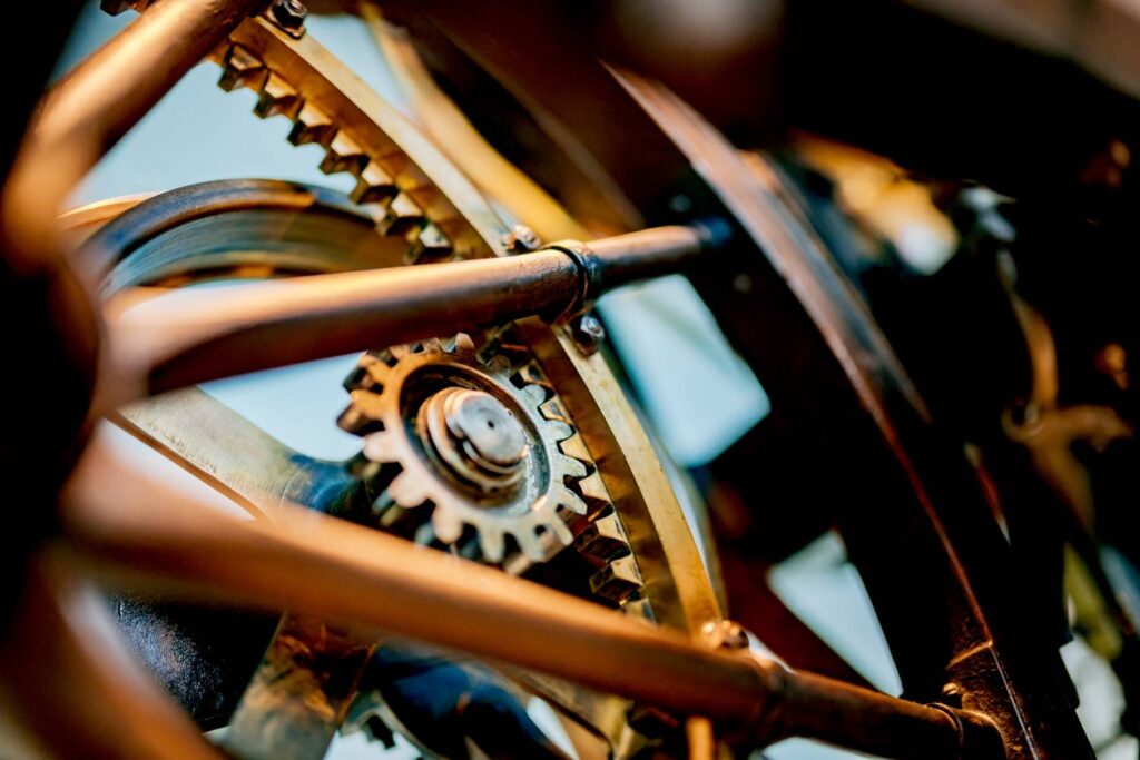 Não há troca de marchas no sentido moderno. Mas a correia pode ser colocada em duas polias com diâmetros diferentes – isso oferece duas relações fixas diferentes. A caixa de redução, composta por pinhão e coroa, é uma peça da engenharia moderna da época. O guidão reto provavelmente foi inspirado nas chamadas bicicletas de segurança com rodas do mesmo tamanho, desenvolvidas na mesma década.