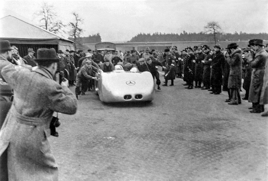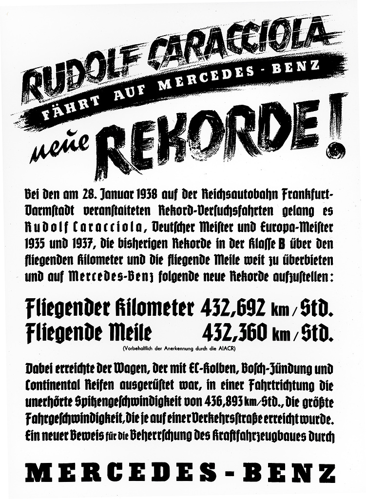 Na década de 1930, as corridas de recordes mundiais eram tão importantes quanto as corridas de Grande Prêmio. A Mercedes-Benz e outros fabricantes líderes estão perseguindo recordes. Um ponto alto ocorreu em 28 de janeiro de 1938: os carros recordistas da Mercedes-Benz e da Auto Union competiram entre si em um trecho da autobahn Frankfurt-Darmstadt. Rudolf Caracciola, o piloto de maior sucesso de toda uma época, disputará a marca com a estrela. Ele se torna campeão europeu três vezes na década de 1930. O título pode ser comparado ao de um atual campeão mundial de Fórmula 1. Para o recorde mundial de velocidade em vias públicas no quilômetro voador, é determinada a média das viagens de ida e volta. Caracciola chega a 432,7 km/h. Este recorde permaneceu válido há 79 anos: só em 2017 outro veículo foi mais rápido.