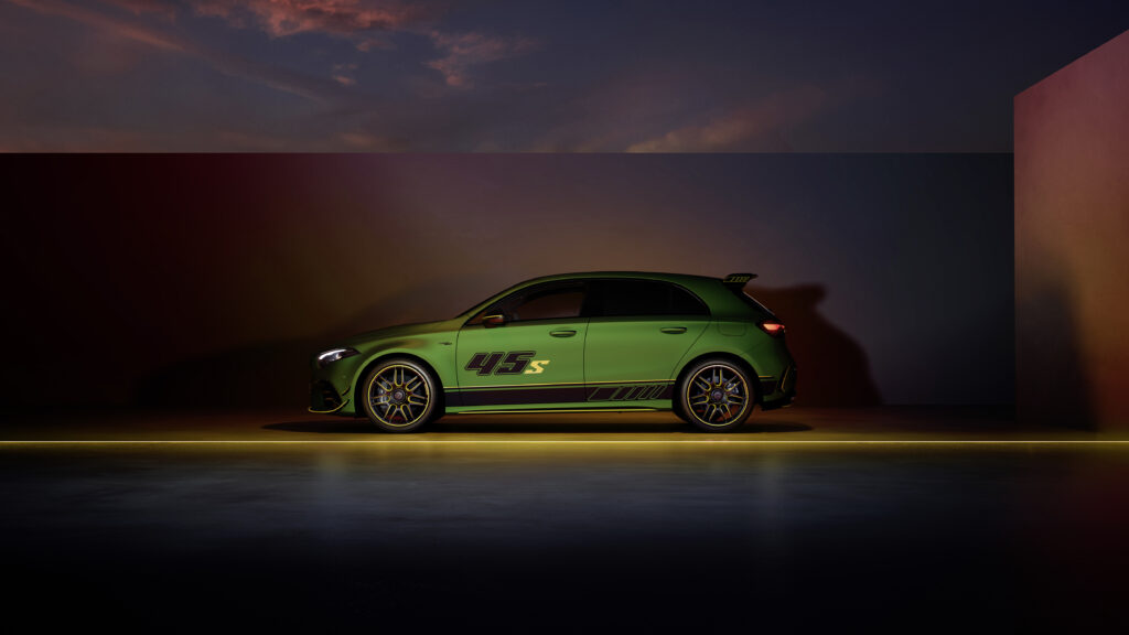 A pintura exclusiva “AMG green hell magno” é o destaque. Esta cor não estava disponível anteriormente para a classe compacta. Há também o revestimento com o logotipo AMG e uma grande inscrição “A 45 S” nas portas e o brasão AMG no capô. A “Edição Limitada” conta com rodas forjadas AMG de 19 polegadas em preto fosco com desenho de sete raios duplos, reservadas para a Edição. O amarelo como cor contrastante acentua os raios do aro. Para combinar com a cor das rodas, as pinças do sistema de freios de alto desempenho AMG são coloridas em preto brilhante e possuem logotipos AMG em branco. Os detalhes refinados incluem a tampa de combustível exclusiva com o logotipo AMG e o projetor de luz: ele ilumina a estrada com o brasão AMG quando você entra e sai do veículo.