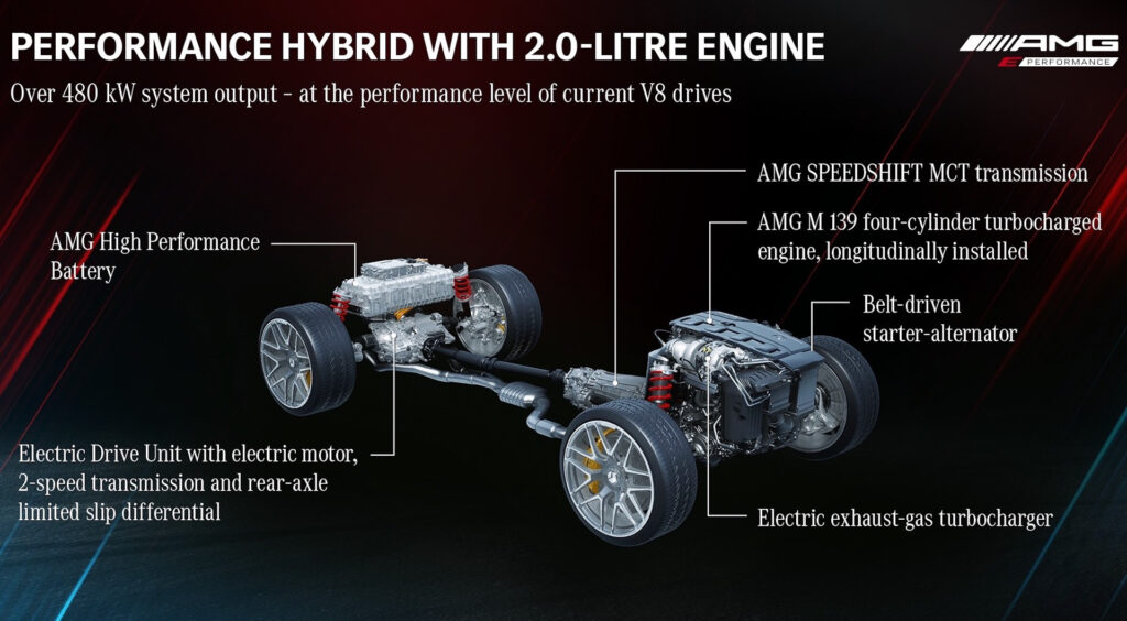 Internamente denominado M139l (l para instalação longitudinal), é o primeiro motor de série do mundo a ser equipado com um turbocompressor de gases de escape assistido eletricamente. Esse sistema inovador é derivado diretamente da tecnologia que a equipe Mercedes-AMG Petronas F1 vem utilizando com tanto sucesso na principal categoria do automobilismo há muitos anos. A nova forma de turbo compressão garante uma melhor resposta em todas as faixas de rotações, proporcionando uma experiência de condução ainda mais dinâmica e eficiente.