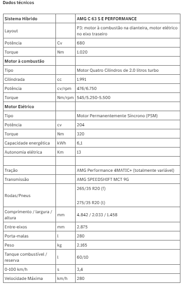 A potência total do sistema combinado é de 680 cv, o torque máximo combinado do sistema é de 104 m.kgf e pela primeira vez em um Mercedes-AMG C 63, o sistema de tração integral totalmente variável AMG Performance 4MATIC+ está disponível para transferir a potência de tração para o asfalto, incluindo um Modo Drift para ainda mais prazer de condução. Além disso, o novo superesportivo é equipado com o eixo traseiro direcional, outra característica única neste segmento.