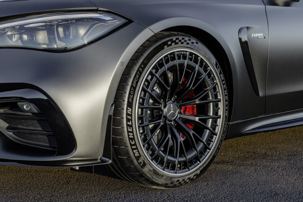 O para-choque dianteiro é elevado na seção central em forma de A (“asa A”). Isso permite uma grande entrada de ar para alto fluxo de ar. Isto também se aplica às entradas de ar externas com duas lâminas transversais. Bordas com formatos distintos estruturam a vista lateral. Os para-lamas dianteiros e traseiros alargados, a via larga (mais 58 milímetros na frente, mais 75 milímetros na traseira em comparação com o modelo Mercedes-Benz) e as rodas de 19 polegadas conferem ao novo AMG Coupé uma aparência poderosa. Rodas de 20 polegadas estão disponíveis como opção.
