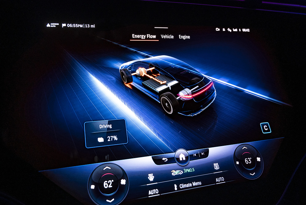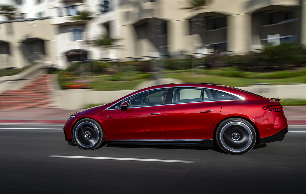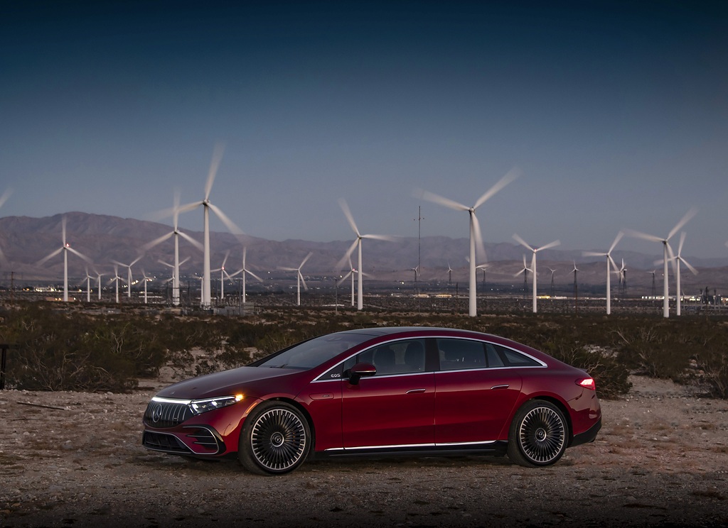 Numerosas opções AMG melhoram a impressão dinâmica, se necessário. Incluem recursos de visual como o AMG Night Package Dark Chrome, pinças de freio vermelhas, elementos de acabamento em carbono e revestimento de assento AMG em couro napa com gráficos específicos. O sedã elétrico também pode ser mais refinado e dinâmico no manuseio, por exemplo, com o hardware correspondente, como o sistema de freio composto de cerâmica AMG de alto desempenho. Há também opção de rodas de liga leve AMG de 21 e 22 polegadas.
