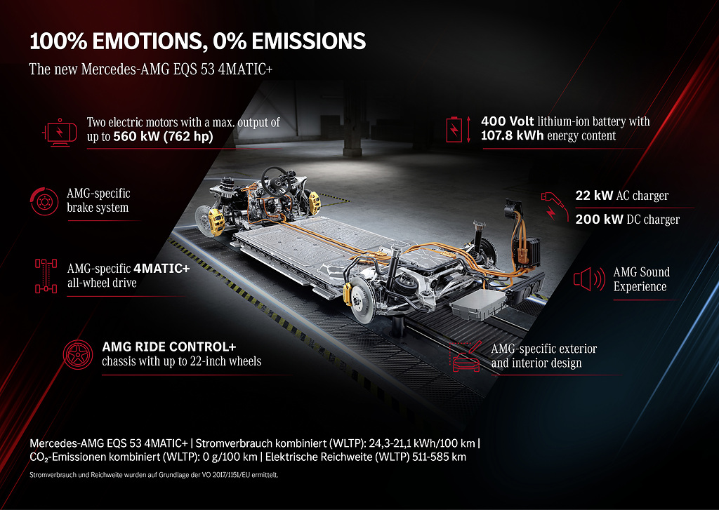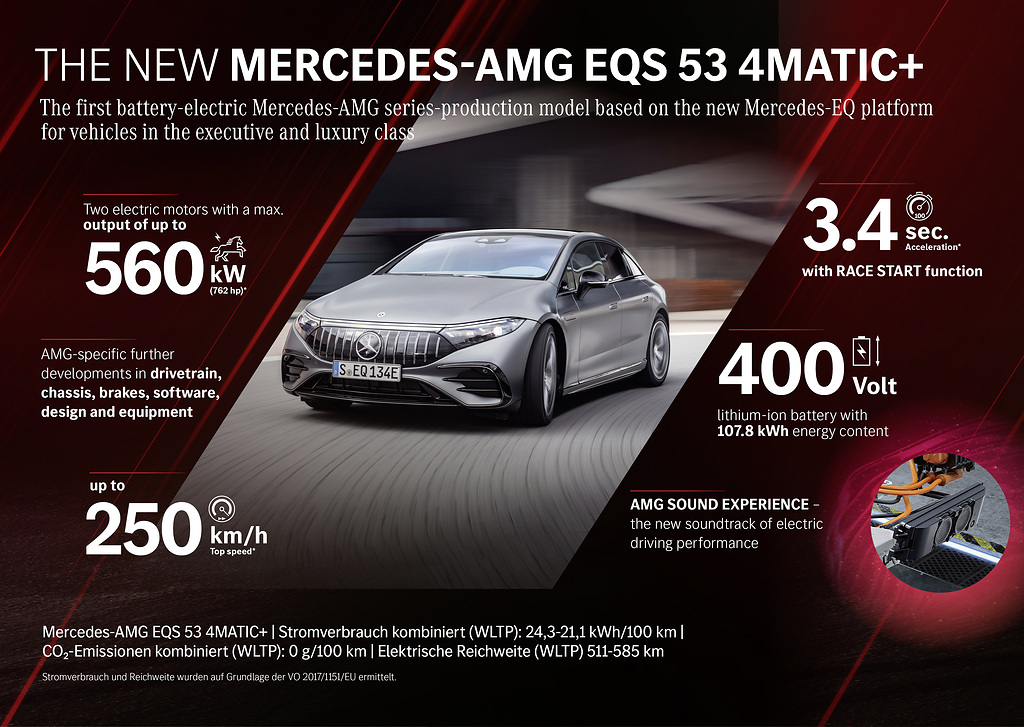 Com o novo EQS 53 4MATIC +, a Mercedes-AMG está a embarcar no futuro totalmente elétrico do Driving Performance. O primeiro modelo de produção AMG elétrico é baseado na arquitetura Mercedes-EQ para veículos de luxo e de classe executivo. O sedã esportivo com uma potência de até 560 kW (760 cv) foi desenvolvido e aprimorado em Affalterbach, berço de todos os modelos AMG.