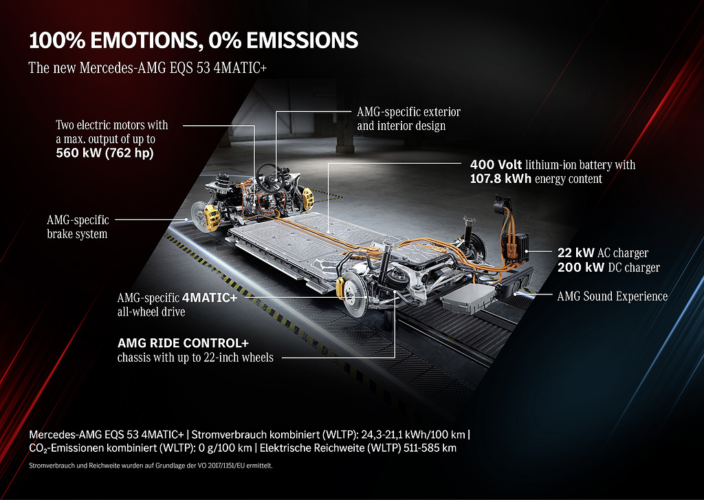 No coração do Mercedes-AMG EQS 53 4MATIC + está seu conceito de direção voltado para o desempenho com dois motores. O trem de força elétrico com um motor no eixo dianteiro e traseiro tem tração nas quatro rodas AMG Performance 4MATIC + totalmente variável, que transmite de forma otimizada a força de tração para o asfalto em todas as condições de condução. A versão básica atinge potência de 484 kW (660 CV), com um torque máximo do motor de 96,8 m.kgf de torque. Com o pacote AMG DYNAMIC PLUS, que é opcional, a potência máxima aumenta para até 560 kW (760 cv) no modo RACE START com função boost. O torque máximo é de até 104 m.kgf de torque.