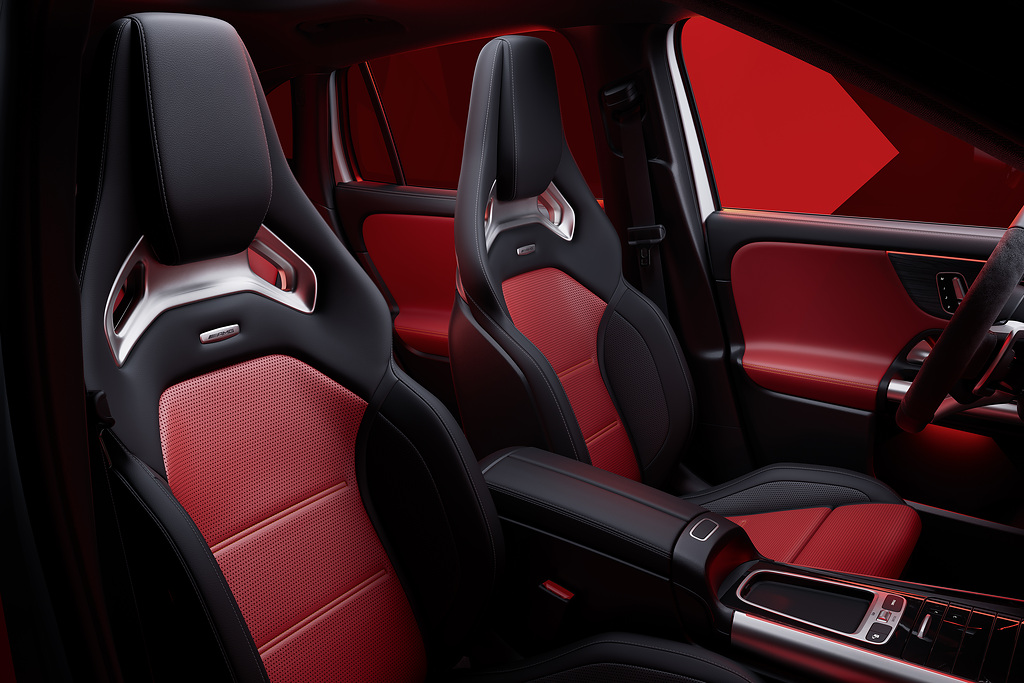 Novos revestimentos para os bancos esportivos padrão ou os bancos AMG Performance estão disponíveis como opcional para o GLA e dão ao interior do SUV um toque contemporâneo. A combinação de couro sintético ARTICO e microfibra MICROCUT agora também pode ser encomendada em marrom bahia. A cor mais recente para o couro sintético ARTICO é cinza sálvia / preto. Pimenta vermelha/preta agora está disponível para os revestimentos de assento de couro pela primeira vez. Nos elementos de acabamento, as opções agora incluem madeira de tília marrom de poros abertos.