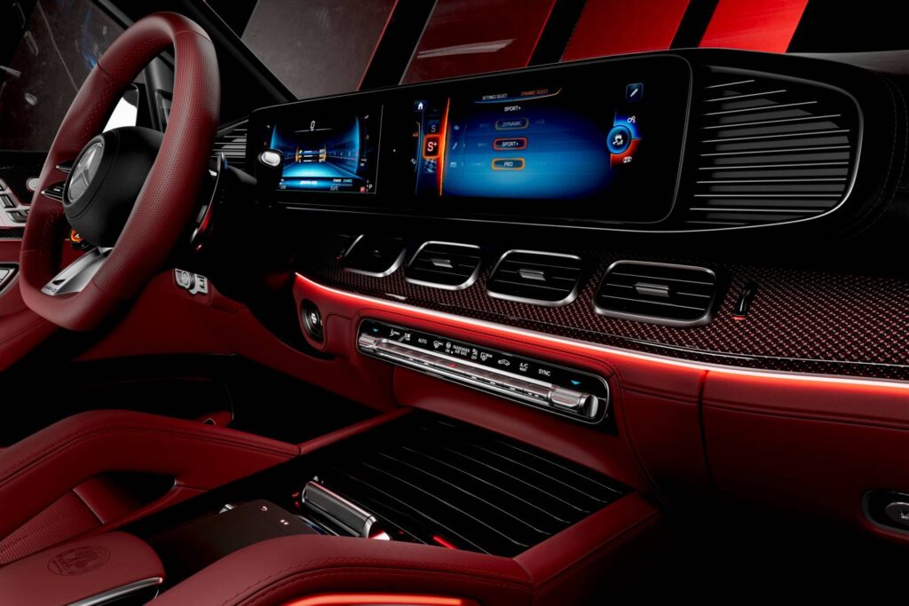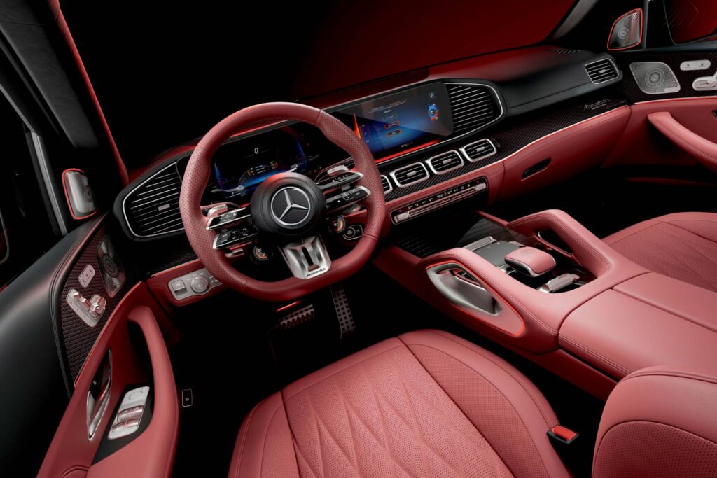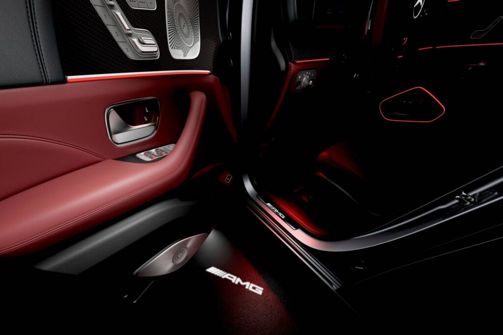 Aprimorando ainda mais o visual da edição especial estão o volante esportivo AMG em couro Nappa vermelho carmim e os elementos decorativos AMG em carbono com bordado vermelho, não oferecidos em nenhum outro modelo. Também contribuem para o ambiente único os brasões AMG estampados nos encostos de cabeça dianteiros e as soleiras das portas AMG pretas com iluminação branca específica da edição. Isso é complementado por apoios de mão específicos da edição com logotipos AMG e tapetes de pelo alto com o logotipo AMG costurado em vermelho sobre couro preto.