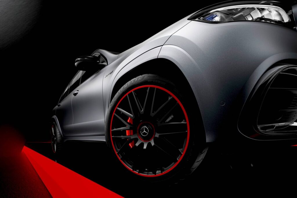 Tais tonalidades são aplicadas nas rodas forjada de 22 polegadas (SUV GLE e cupê) ou 23 polegadas (GLS), com acabamento em preto fosco e detalhes em vermelho. As tampas dos cubos das rodas apresentam o logotipo AMG combinado com elementos em forma de coroa de louros. Pinças de freio vermelhas nos eixos dianteiro e traseiro adicionam entusiasmo ao visual esportivo e elegante.