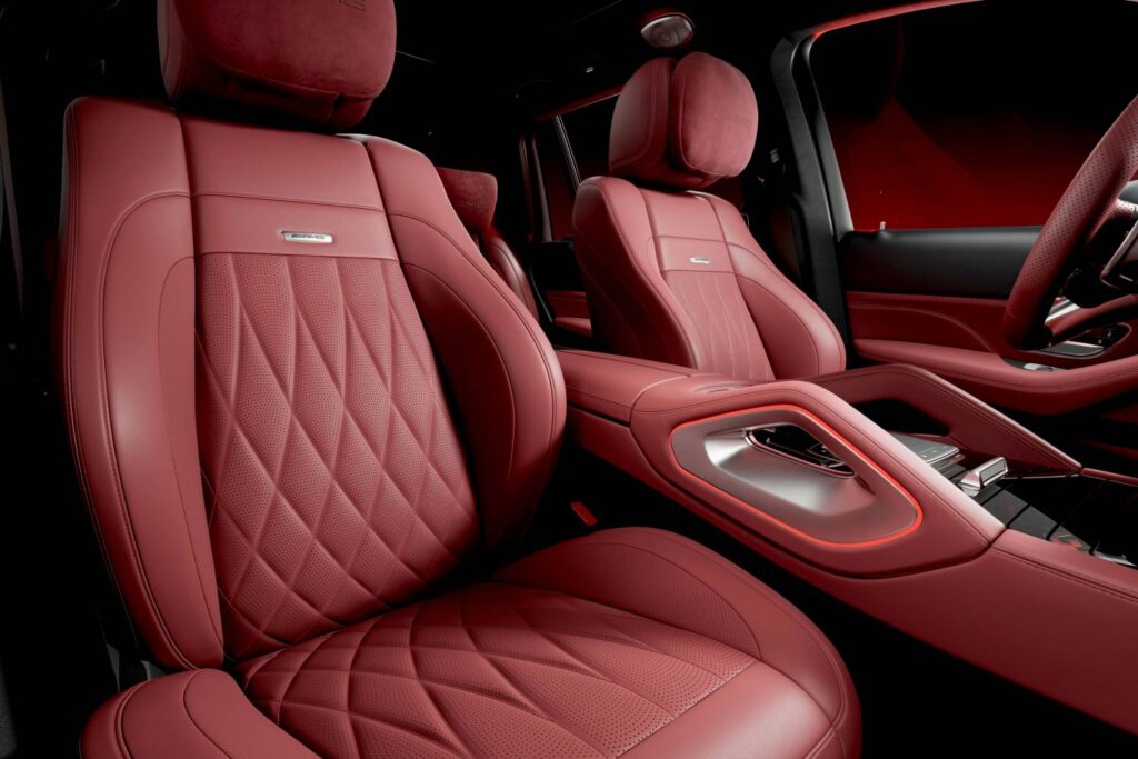 O interior da edição especial limitada também retoma o tema contrastante com motivos em preto e vermelho. O estofamento em couro Nappa Carmine Red / Black com acolchoamento em losango complementa o pacote. Ele também inclui painéis das soleiras das portas com letras AMG iluminadas, encostos de cabeça MANUFAKTUR nos bancos traseiros e o logotipo da edição em cromado brilhante no lado do passageiro.