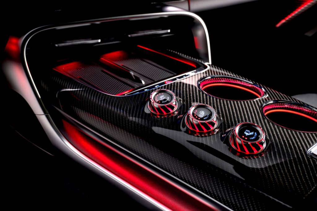 Um dos principais destaques do design interior está no console central: três controles rotativos de dinâmica de condução permitem ajustar instantaneamente a resposta, a derrapagem e o comportamento em curvas. Eles reúnem parâmetros essenciais do caráter do veículo e proporcionam aos motoristas experientes o máximo controle e prazer ao dirigir.