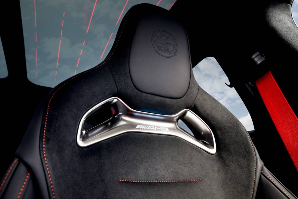 Com seu design esportivo e expressivo, os bancos dianteiros recém-desenvolvidos oferecem excelente suporte lateral em curvas dinâmicas. Os bancos AMG Performance opcionais, com apoios de cabeça integrados, são ainda mais esportivos. Com seus encostos marcantes, ambas as variantes de bancos enfatizam a leveza típica do automobilismo. Duas aberturas no encosto com inserções galvanizadas conferem o máximo de esportividade ao banco Performance e destacam sua construção leve.