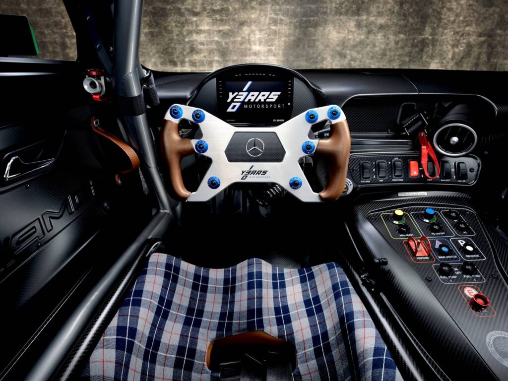 Rodas de magnésio de 18 polegadas com peso otimizado e a ampla implementação de elementos de carbono constroem uma ponte para os carros esportivos de corrida da era moderna, juntamente com um impressionante brasão AMG no teto. A estreita ligação entre tradição e modernidade também é evidente no interior. Tecnologias avançadas de automobilismo, como o display de cockpit Bosch DDU 10 com tela ampliada e gráficos de alta resolução, dão suporte à operação do veículo.