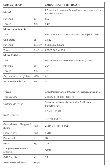 A Mercedes-Benz Cars & Vans do Brasil apresenta o novo Mercedes-AMG SL 63 S E PERFORMANCE, mais um produto de sua marca de alta performance equipado com a tecnologia híbrida plug-in criada para a Fórmula 1. O veículo é um ícone da história da marca e combina exclusividade, conforto, luxo e o alto desempenho que só um produto com o DNA Mercedes-AMG pode oferecer. O novo modelo carrega o legado de quase 70 anos criado a partir do 300 SL de 1952, automóvel de corrida e que rapidamente atingiu o status de lenda.