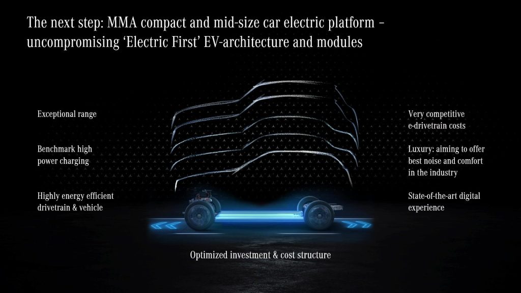 Espera-se que essa nova gama de carros compactos venha com preços mais altos enquanto “eleva a substância tecnológica”. A última parte refere-se a uma nova arquitetura de software MB.OS e à adoção de inovações do programa Vision EQXX. Embora a Mercedes-Benz continue comprometida com carros compactos, 75% de seus investimentos totais futuros são reservados para veículos maiores (a partir do Classe C), pois estes têm margens de lucro mais altas.
