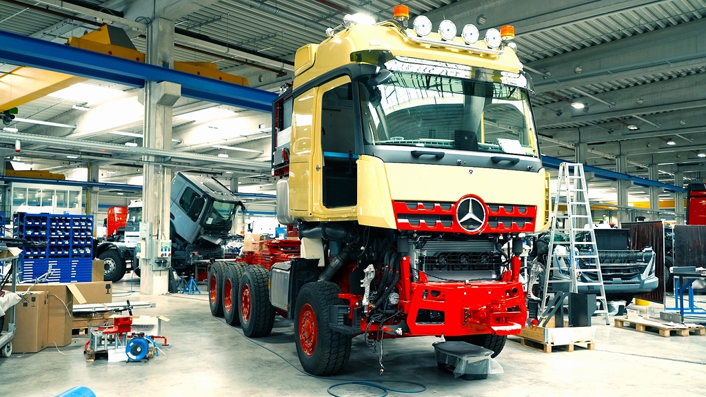 Os pedidos especiais dos clientes são implementados pela organização empresarial Mercedes-Benz Custom Tailored Trucks (CTT) na maior fábrica de conversão de camiões Mercedes-Benz. Na fábrica em Molsheim, na França, o veículo recebeu um eixo adicional e assim se tornou um veículo 8×6 de quatro eixos. Além disso, a modernização incluiu engate de quinta roda, controle deslizante para serviço pesado e acoplamentos de reboque para serviço pesado. Na frente é montado o acoplamento robusto Rockinger tipo 56e. Na parte traseira o cliente pode montar o acoplamento de reboque Rockinger tipo RO58E de 1000 toneladas. Atrás da cabine foi instalado um sistema de refrigeração montado na parte traseira, além de um tanque de combustível de 900 litros e o sistema hidráulico de direção do semirreboque. Após cerca de 14 semanas, os pré-requisitos para o trator pesado foram atendidos e a conversão em Molsheim foi concluída.