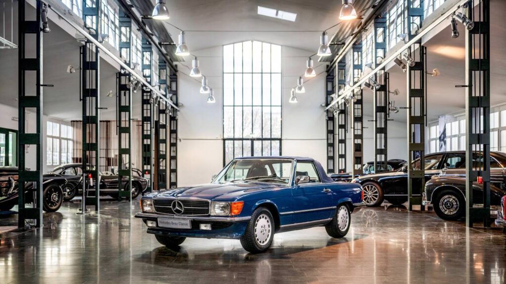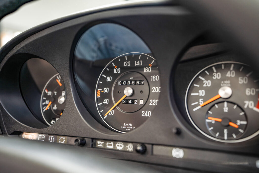 Também à venda: um 300 SL da série de modelos R 107 de 1988. Sua quilometragem original de apenas 3.587 quilômetros é impressionante. A condição deste clássico é correspondentemente boa. O 300 SL também se destaca com seu acabamento de pintura incomum em azul surf (DB900) – uma das cores mais raras para esta série de modelos produzida de 1971 a 1989. Em combinação com o interior de couro cinza e a transmissão manual, isso cria uma impressão geral esportiva e elegante.