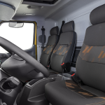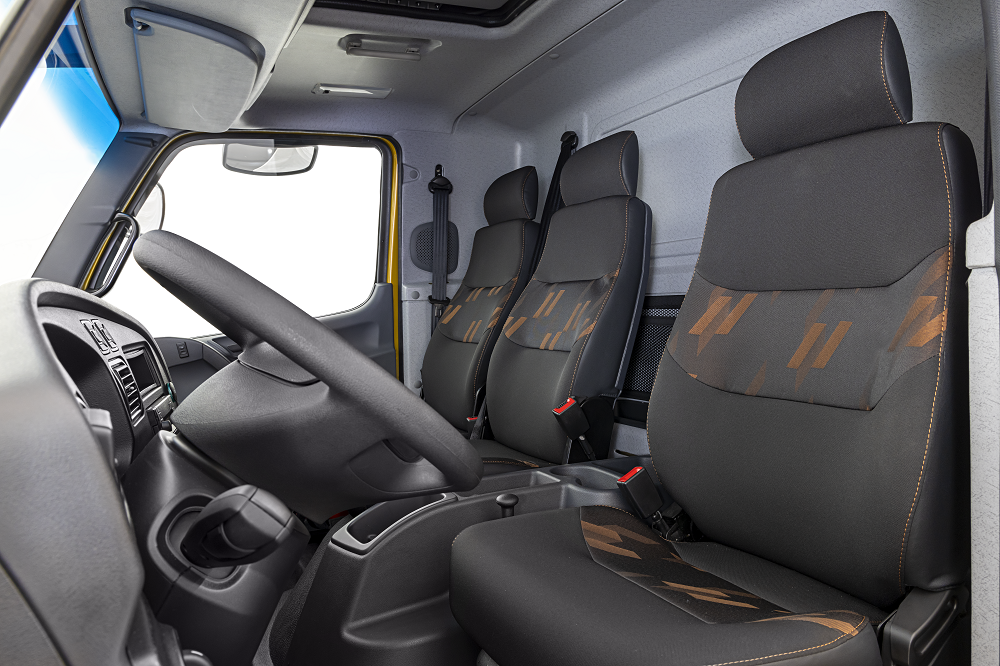 Na linha Accelo 2023, o interior da cabina ganha novo revestimento do teto, tacógrafo no teto e um espaço adicional para equipamentos, tanto no teto, quanto no painel.