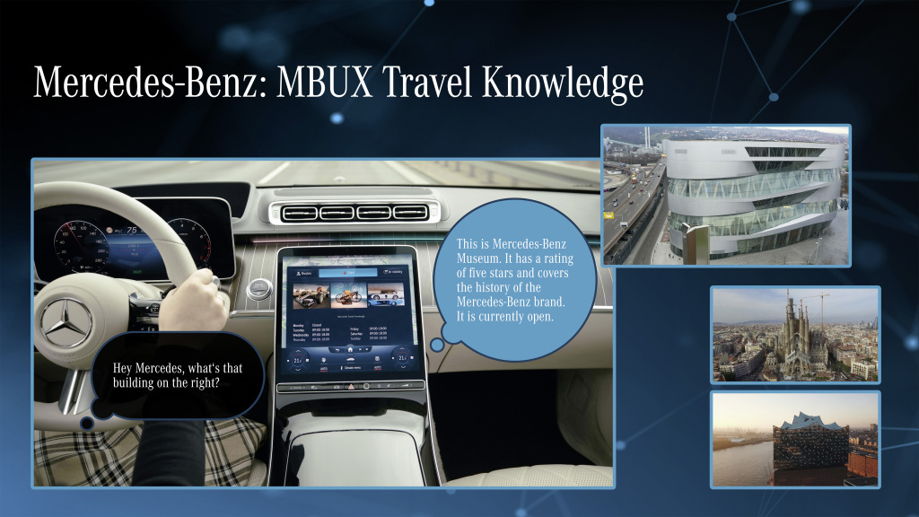 Exclusivamente na CES, a Mercedes-Benz apresenta pela primeira vez uma nova funcionalidade MBUX: “Mercedes Travel Knowledge”. Esta função inteligente avalia os dados do mapa e, além disso, os arredores e fornece muitas informações sobre pontos de referência interessantes ao longo do percurso, desde edifícios individuais ou pontos de interesse a cidades inteiras. O motorista ou passageiro pode simplesmente fazer uma pergunta ao passar – por exemplo, “Ei, Mercedes, o que você pode me dizer sobre este prédio?” ou “Ei, Mercedes, qual é o nome do restaurante à esquerda?” – e as informações aparecem no respectivo display e também faladas pelo assistente de voz. Graças ao conceito de atualização flexível do MBUX via nuvem, esse recurso também estará imediatamente disponível no novo Classe S, além do EQS.
