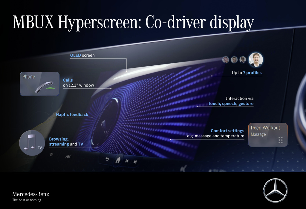 “Ao desenvolver o MBUX Hyperscreen, o foco estava claramente no cliente”, disse Sajjad Khan. “O objetivo era um conceito sem distrair o motorista ou operação complicada, mas que fosse capaz de aprender graças à inteligência artificial. O resultado fala por si: o MBUX Hyperscreen entende o cliente cada vez melhor e, portanto, oferece um infotainment personalizado e uma oferta operacional antes que o usuário tenha que clicar em qualquer coisa. Isso é orientação para o cliente e pensamento digital em 2021. “