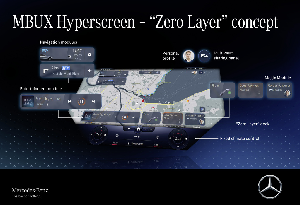 Para obter os aplicativos mais importantes na tela MBUX Hyperscreen, o usuário não precisa rolar pelos submenus ou inserir comandos de voz. É por isso que a Mercedes-Benz chama o sistema de “camada zero”. Os aplicativos mais importantes, como navegação ou telefone, são sempre oferecidos situacionalmente e contextualmente no nível superior do campo de visão. Mais de 20 outras funções – desde o programa de massagem ativa até sugestões para a lista de afazeres – são exibidas automaticamente com a ajuda da inteligência artificial se forem relevantes para o cliente.