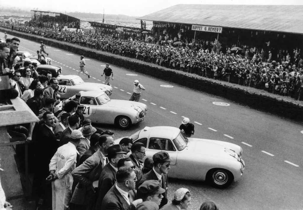 Mercedes-Benz 300 SL (W 194), largada das 24 Horas de Le Mans em 1952. Ao centro, o veículo de Hermann Lang e Fritz Rieß com o número 21 de largada.