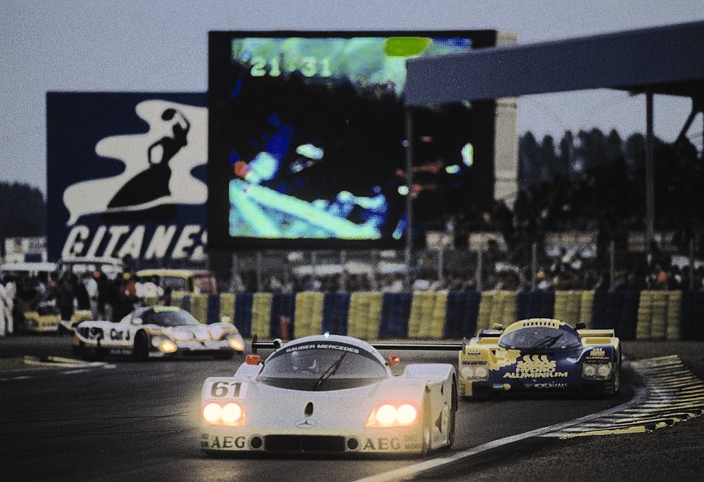 Sauber-Mercedes C 9 Grupo C, nas 24 Horas de Le Mans de 1989, vencida pela Sauber-Mercedes com uma dobradinha. Carro dos últimos vice-campeões Mauro Baldi, Kenny Acheson e Gianfranco Brancatelli com o número inicial 61