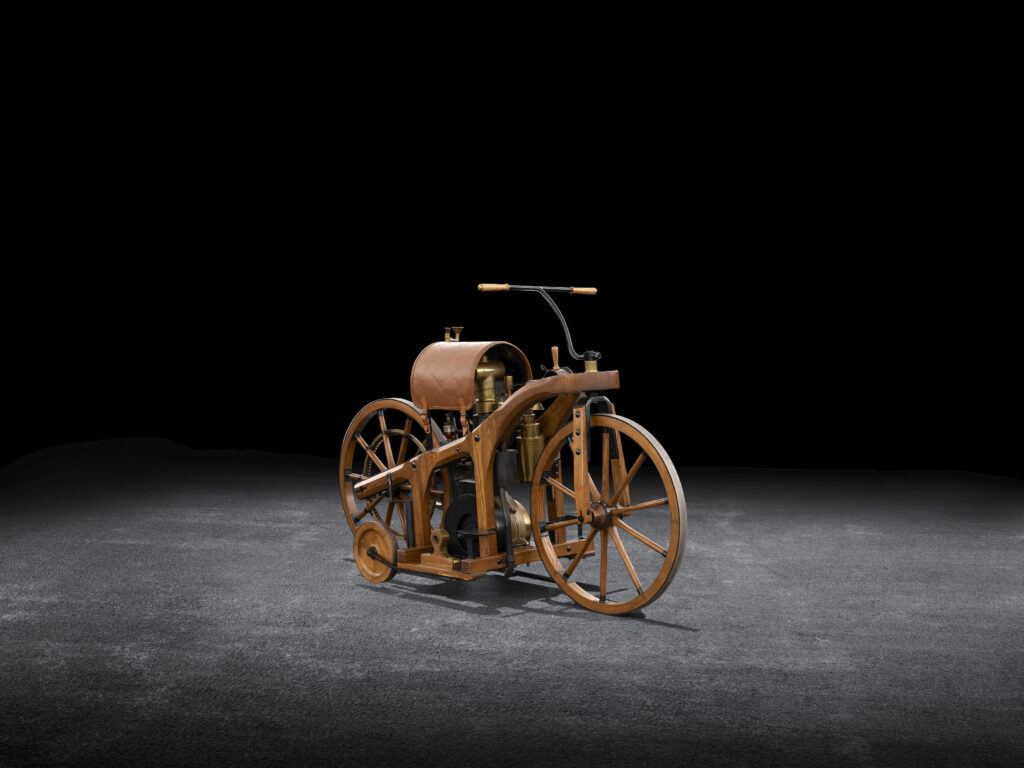 Em 1885, Gottlieb Daimler e Wilhelm Maybach avançaram no desenvolvimento do motor de quatro tempos para propulsão de veículos. Comparado ao motor de Nicolaus August Otto, a velocidade do motor aumentou significativamente e os pioneiros automotivos reduziram bastante o tamanho e o peso do motor. O motor compacto com cilindro vertical foi chamado de “relógio de pêndulo” devido à sua aparência característica. Agora era hora de testá-lo em um veículo. A escolha recaiu sobre um veículo de duas rodas com estrutura e rodas de madeira.