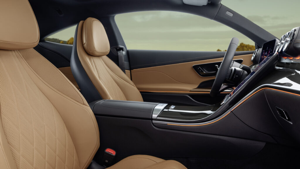Outro destaque são os bancos dianteiros em design esportivo integral, desenvolvidos exclusivamente para o CLE. Em conjunto com o sistema de som surround Burmester® 3D opcional, cada um deles possui dois alto-falantes ao nível dos apoios de cabeça e, assim, criam uma experiência musical particularmente individual e imersiva com Dolby Atmos e Spatial Audio próximos aos ouvidos.