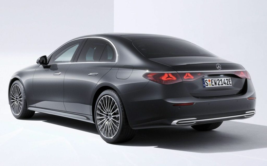O topo linha da nova geração Classe E é a EXCLUSIVE, possui a grade do radiador com borda e elementos decorativos com três frisos duplos cromados, para os fãs da marca, o clássico ornamento da estrela sob o capô. O visual do para-choque dianteiro e traseiro apresenta contornos mais elegantes e cada peça possui um elemento de acabamento cromado. A inserção nas soleiras laterais é cromada, assim como a linha de cintura e a faixa de acabamento em torno das janelas. O acabamento padrão da linha de equipamentos é preto obsidiana metálico.