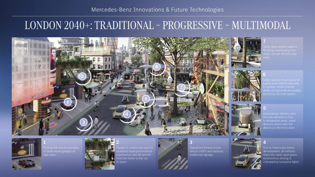Um cenário urbano está sendo desenhado para Londres, no qual uma combinação de elementos tradicionais e modernos caracteriza a paisagem urbana. Em 2040+, o centro da cidade poderá ser redesenhado para se tornar mais habitável e sustentável. Os edifícios antigos seriam combinados com telhados e fachadas verdes, bem como parques e árvores adicionais para melhorar o clima urbano. O tráfego automóvel seria bastante reduzido e substituído por uma combinação de bicicletas, transportes públicos e táxis-robôs. Soluções de estacionamento centralmente localizadas conectariam veículos, bicicletas e transporte público. Vans elétricas e bicicletas de carga forneceriam transporte de última milha.