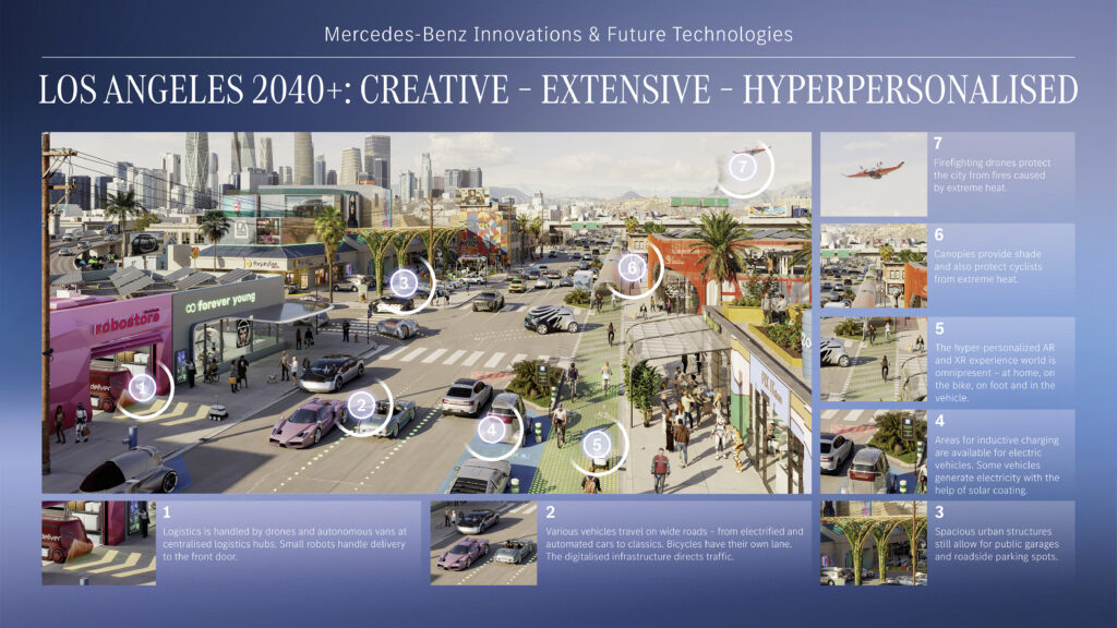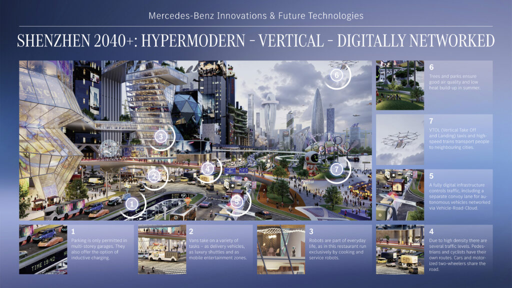 Os pesquisadores da Mercedes-Benz desenvolveram imagens futuras das cidades de Londres, Los Angeles e Shenzhen nos anos após 2040. Eles mostram exemplos de como as áreas urbanas na Europa, EUA e China podem mudar como resultado da digitalização e das mudanças climáticas. A velocidade da transformação varia muito devido às condições políticas, culturais, econômicas e climáticas. A troca de conhecimento e opinião forma a base para a integração ideal de veículos na cidade – e, portanto, o ponto de partida para futuras cooperações da Mercedes-Benz com cidades inteligentes.