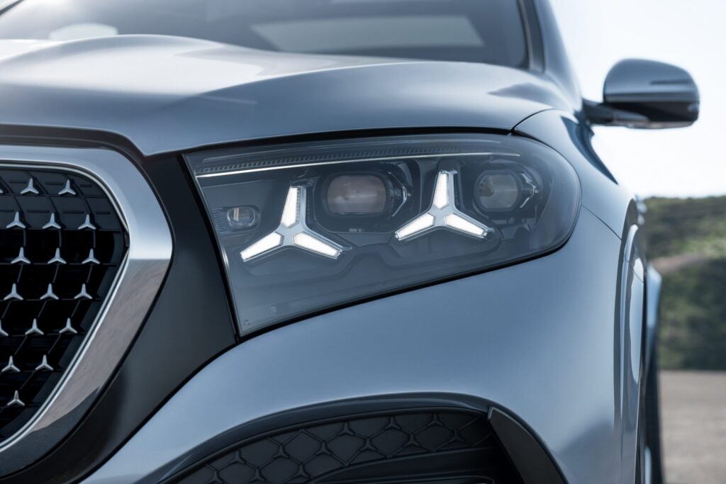A dianteira redesenhada caracteriza-se por uma grade maior com estrela central iluminada opcional e iluminação de contorno. Os novos faróis com dois emblemas de estrela dispostos horizontalmente definem a assinatura luminosa. A tecnologia DIGITAL LIGHT aprimorada com micro-LEDs está disponível como opcional, oferecendo maior resolução e melhor distribuição de luz.