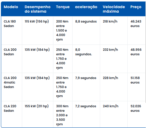 O novo CLA, com um motor de quatro cilindros em linha de 1,5 litros totalmente novo e eletrificado, pode ser encomendado a partir de hoje em três níveis de potência e com opção de tração dianteira ou integral, através das concessionárias parceiras da Mercedes-Benz na Europa. Na Alemanha, os preços começam em 46.243 euros, na versão CLA 180.
