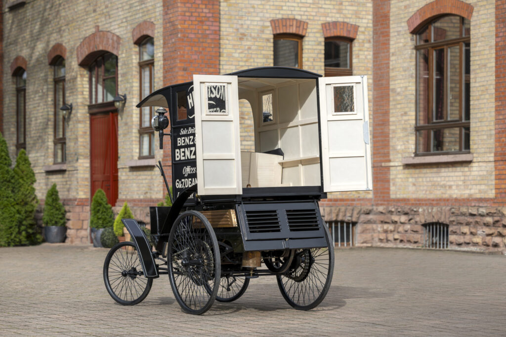 Este exemplar restaurado não foi construído na Alemanha, mas sim na Inglaterra – pela Hewetson’s Ltd. , a representante oficial da Benz na ilha na época. Na Grã-Bretanha, a van foi comercializada como “Ideal Van “. Seu motor produzia 3 cv e permitia uma carga útil de cerca de 100 kg, incluindo o motorista. Modelos posteriores tinham uma potência aumentada para 3,5 cv e podiam transportar até 250 kg.