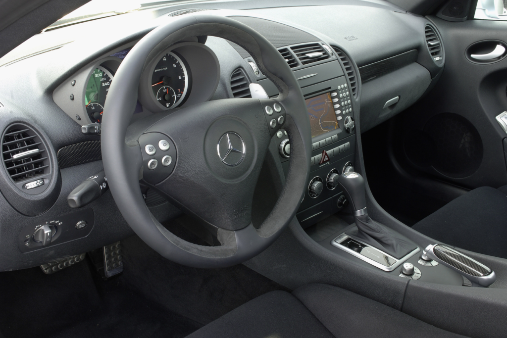 A AMG também confiou no DNA do automobilismo no interior. O motorista e o passageiro da frente acomodavam-se em bancos esportivos AMG, revestidos em veludo Perlon preto e que ofereciam o melhor suporte lateral. O cockpit era complementado pelo volante esportivo ergonômico AMG com alavancas de câmbio de alumínio, que oferecia controle ideal sobre os 400 cv. Aquecimento dos bancos, sensores de estacionamento e revestimento do teto em Alcantara foram omitidos. O botão para o teto retrátil é apenas um modelo na Série Black.