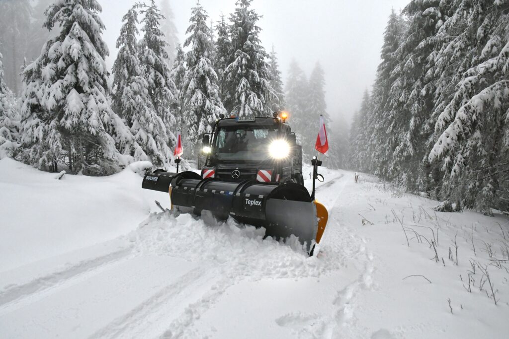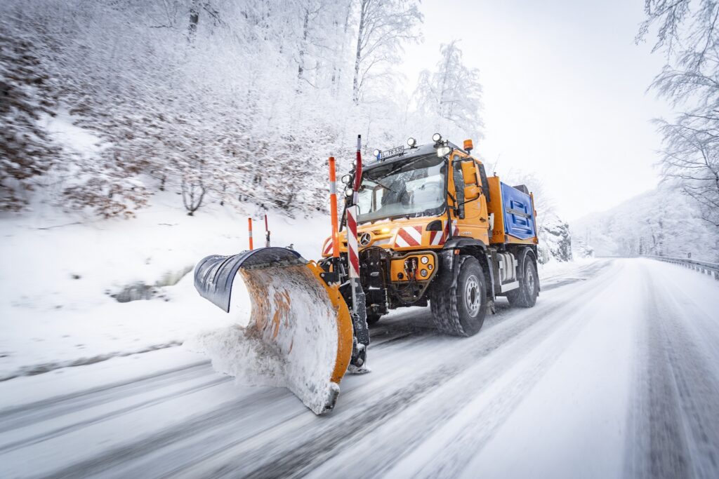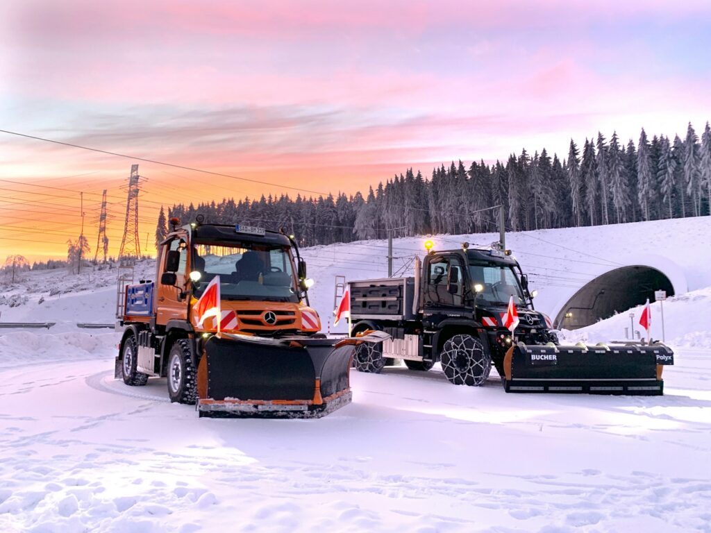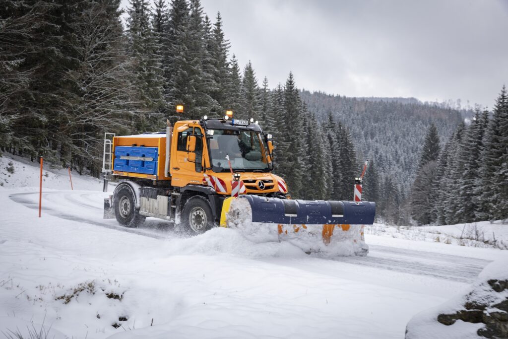 O Unimog ExpertPartner Bucher Municipal equipou o veículo com seu novo limpa-neve com asas Wingx LN2636t e um Yeti W27 com VarioMax e seção espalhadora intercambiável.