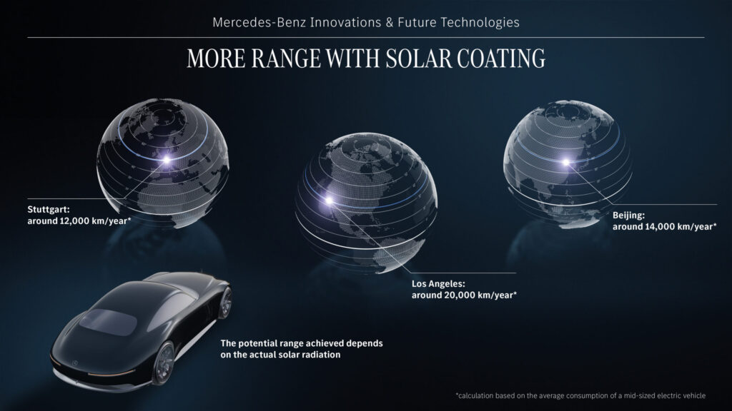 A Mercedes-Benz está pesquisando módulos solares inovadores que poderiam ser aplicados perfeitamente à carroceria de veículos elétricos, semelhantes a uma pasta fina como uma bolacha. A superfície fotovoltaica ativa poderia ser adaptável a vários substratos. Quando aplicada a toda a superfície do veículo do Iconic Vision, um alcance adicional poderia ser aproveitado do sol, dependendo da localização geográfica e das condições locais. Como exemplo, uma área de 11 metros quadrados (equivalente à superfície de um SUV de médio porte) poderia produzir energia por até 12.000 quilômetros por ano em condições ideais [1] . O revestimento não contém terras raras ou silício e pode ser facilmente reciclado. As células solares têm uma alta eficiência de 20% e geram energia continuamente – mesmo quando o veículo está desligado.